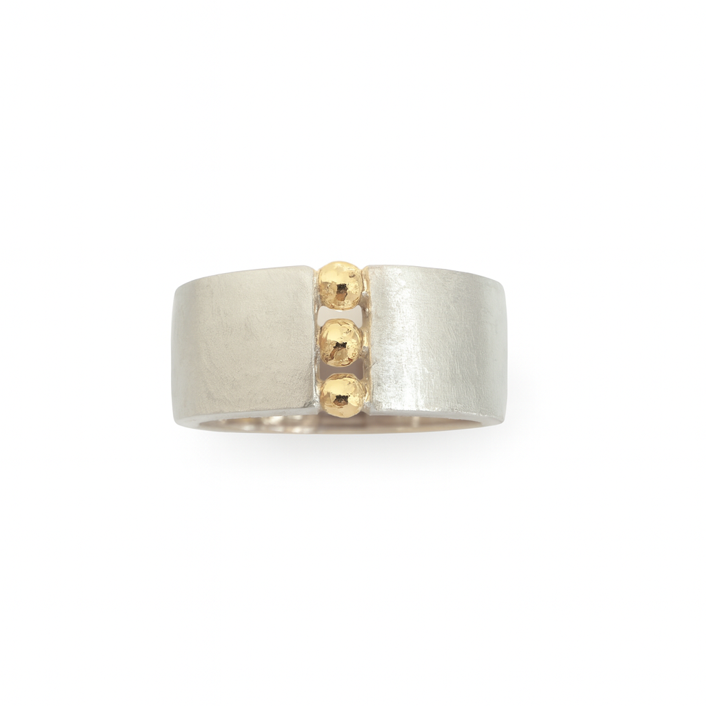 Der Drei-Perlen-Ring verbindet kühles 925er Silber mit warmen Akzenten aus 24-karätigem Gold. Drei goldene Kugeln bilden das strahlende Zentrum und setzen einen markanten Kontrast zur klaren Silberfläche. In sorgfältiger Handarbeit wird jedes Detail modelliert, verlötet, gefeilt und poliert. So entsteht ein kraftvoller Ring, der sowohl im Alltag besticht als auch bei besonderen Momenten glänzt.