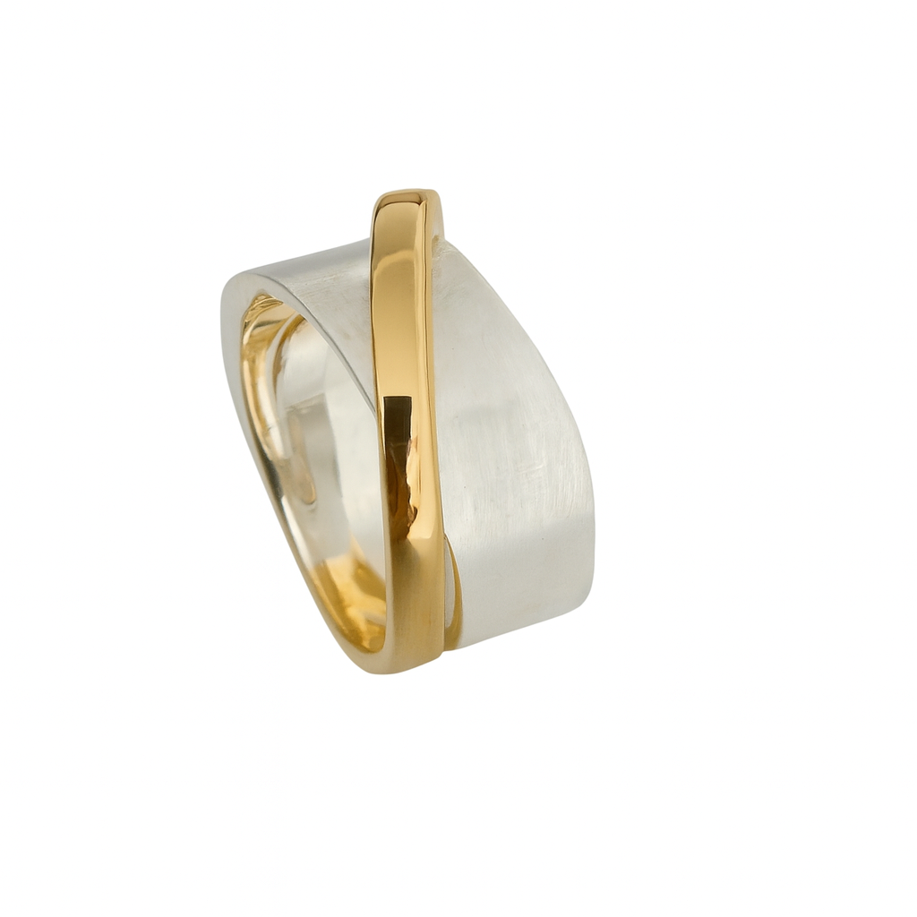 Ein Ring, in dem Gegensätze verschmelzen: Mattiertes 925er Silber trägt den sanft geschwungenen Schwung von 24-karätigem Gold. Wie zwei Wege, die sich kreuzen und in einem edlen Gleichklang weiterfließen.