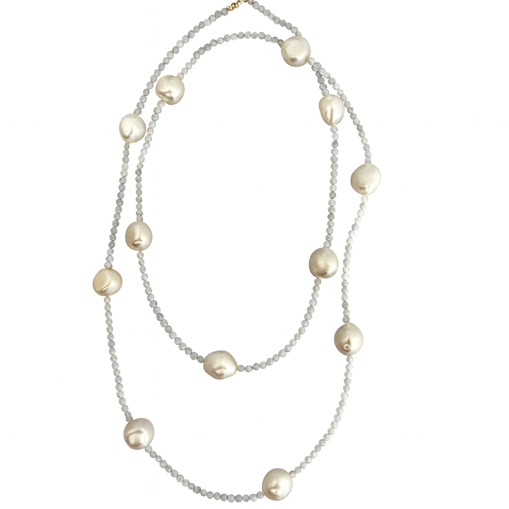 Aurora-Kette – 92 cm voll schimmernder Süßwasserzuchtperlen und Bergkristalle. Wie gefangenes Morgenlicht, das sich sanft um den Hals legt – elegant, zeitlos, einzigartig.