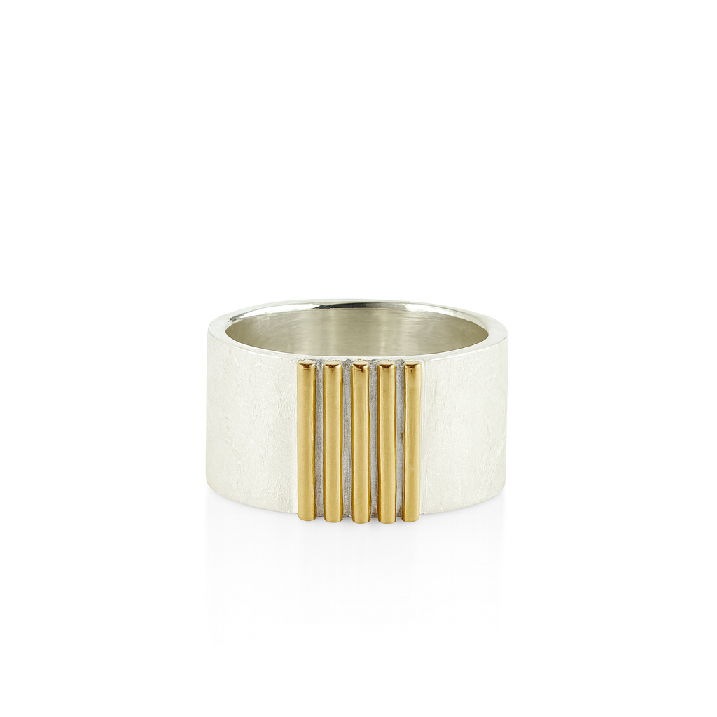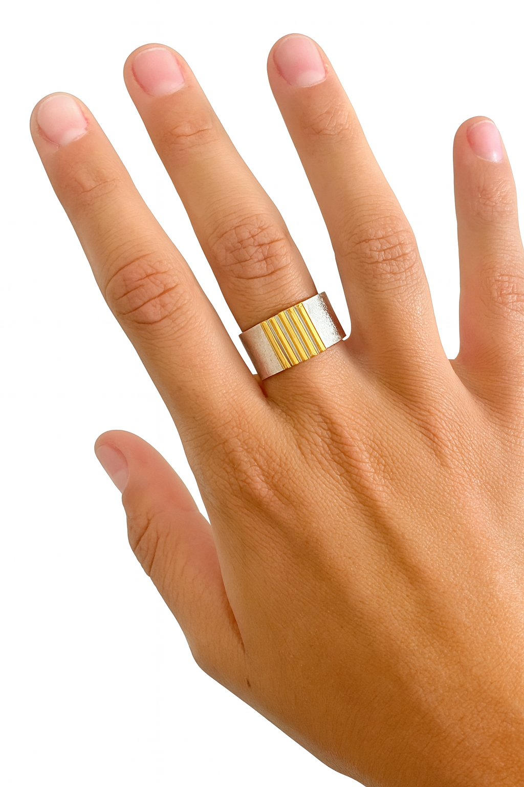 Ein Ring wie ein stilles Versprechen: Kühl schimmerndes 925er Silber trägt fünf feine Linien aus 24-karätigem Gold, die wie Sonnenstrahlen in der Klarheit des Metalls erblühen. Ein moderner Kontrast von Ruhe und Glanz.